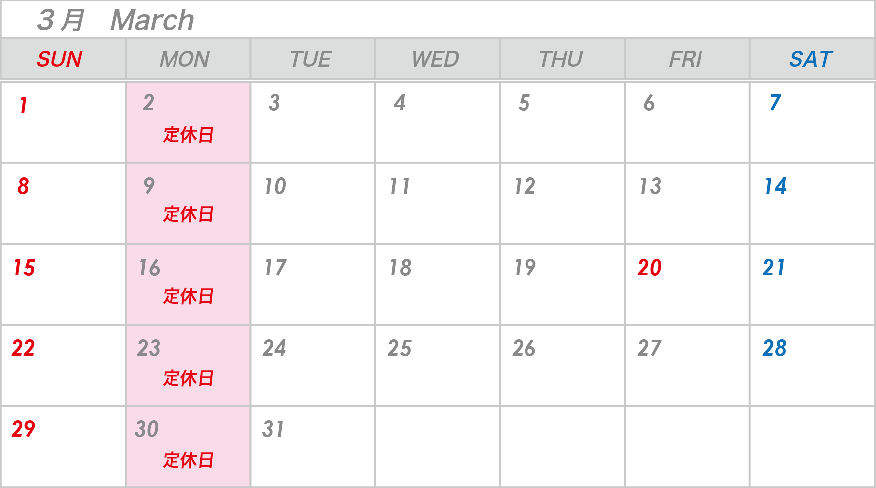 【定 休 日】 毎週月曜日、他